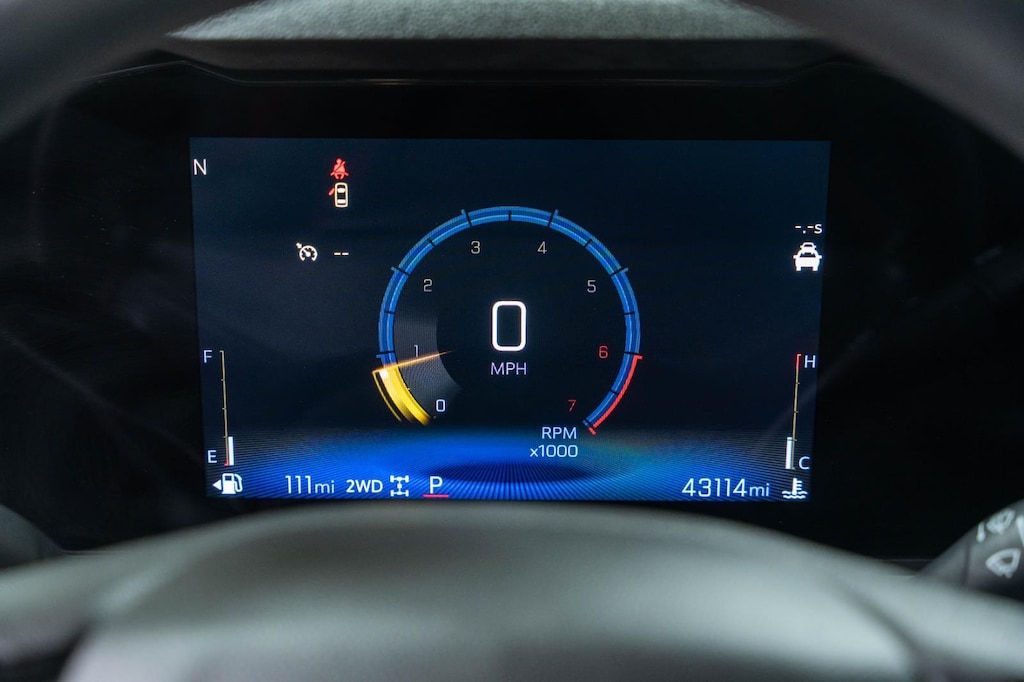 - The vehicle is equipped with a camera that displays an image of the area behind the vehicle on an interior display.