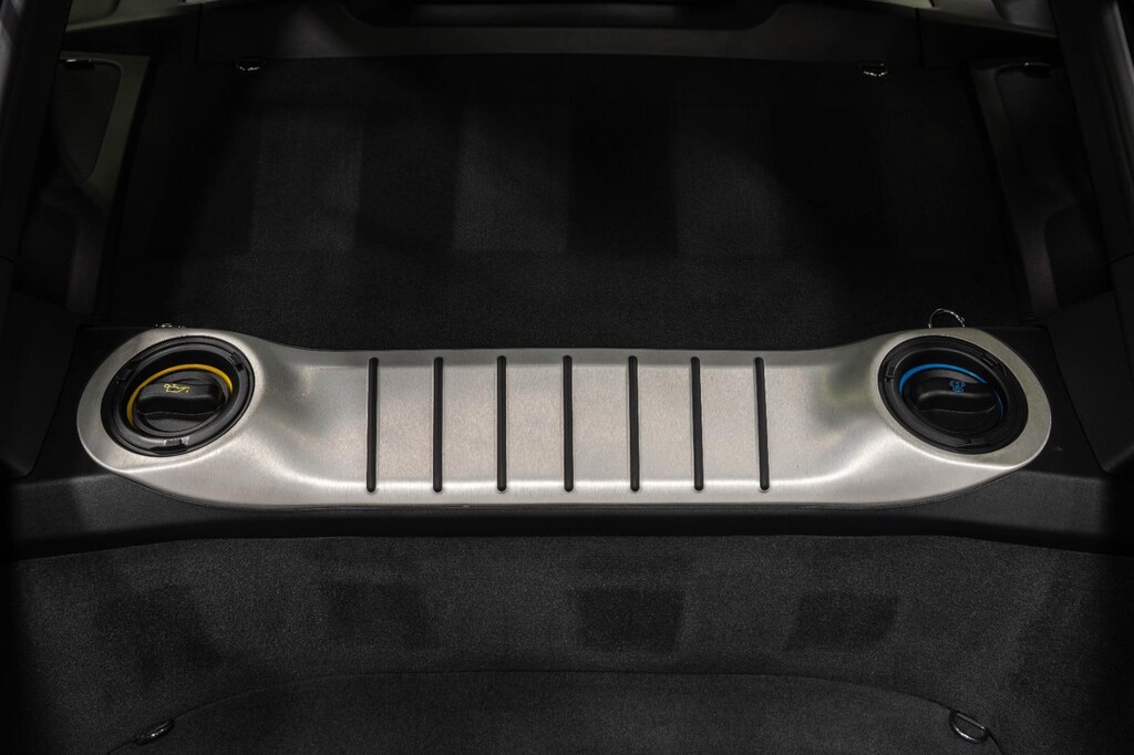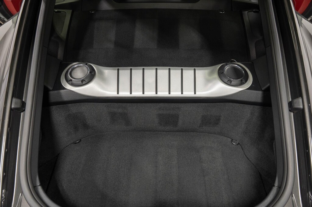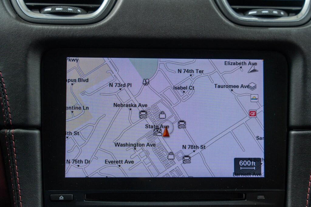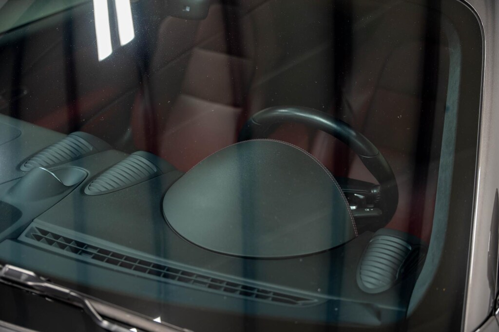 - The vehicle is equipped with a camera that displays an image of the area behind the vehicle on an interior display.