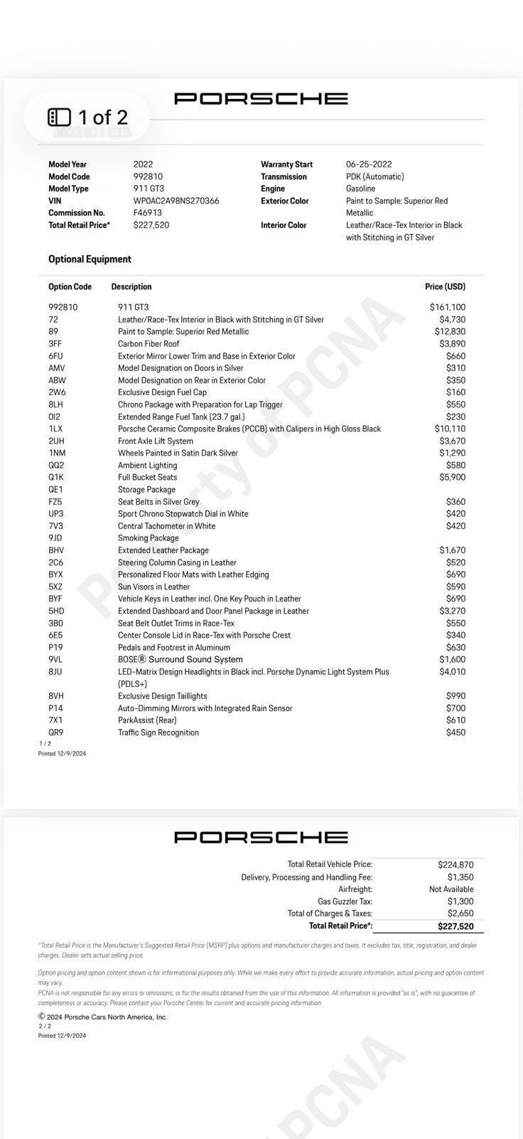 This 2022 Porsche 911 GT3, has a Custom Color exterior with a Black w/GT Silver Stitching interior. Call us at 913-601-5486 and reference stock Number 214103 for further details. IMPORTANT PACKAGE INFORMATION: