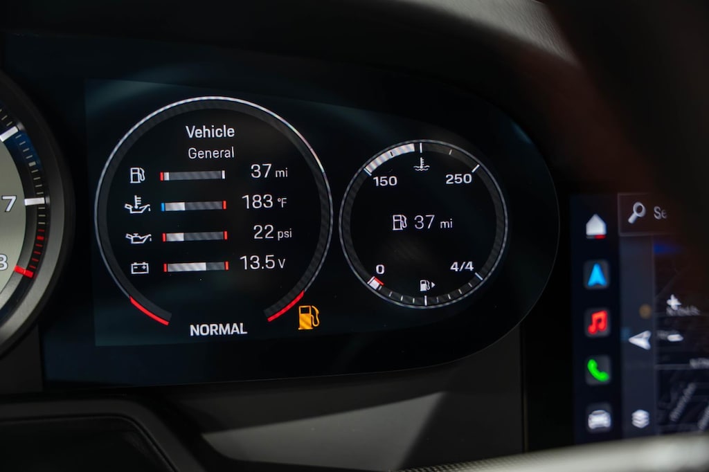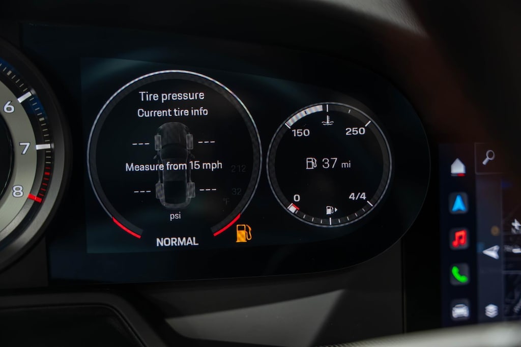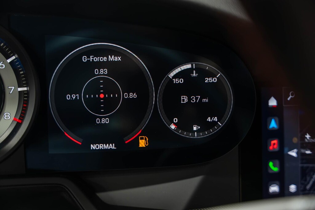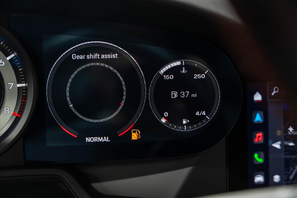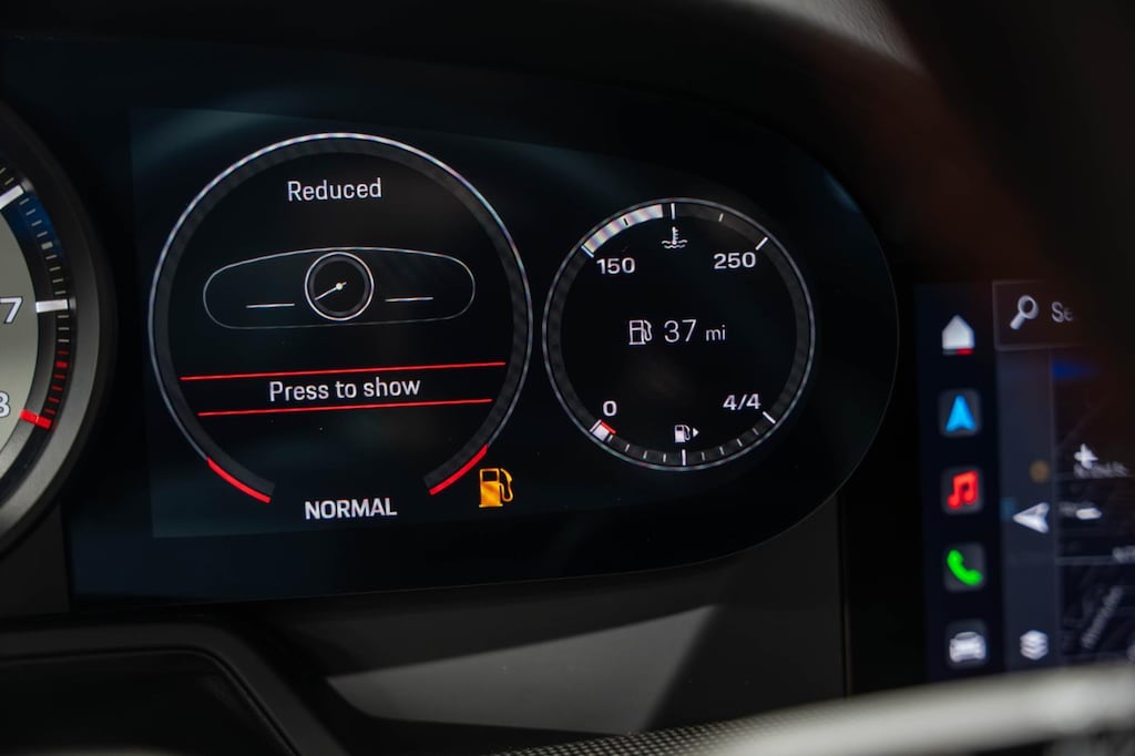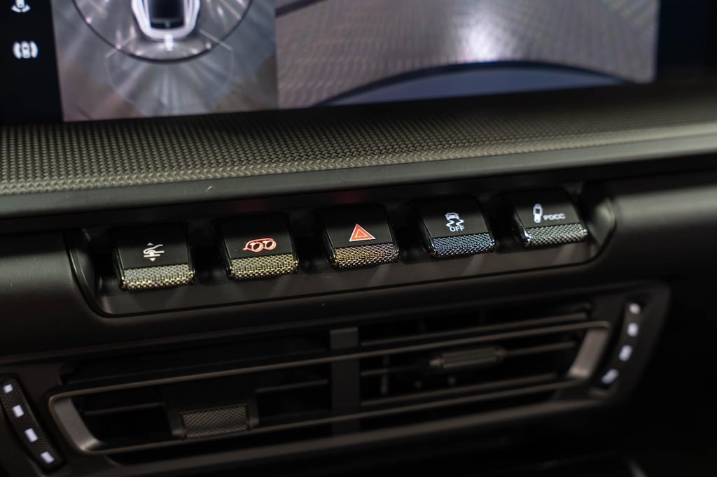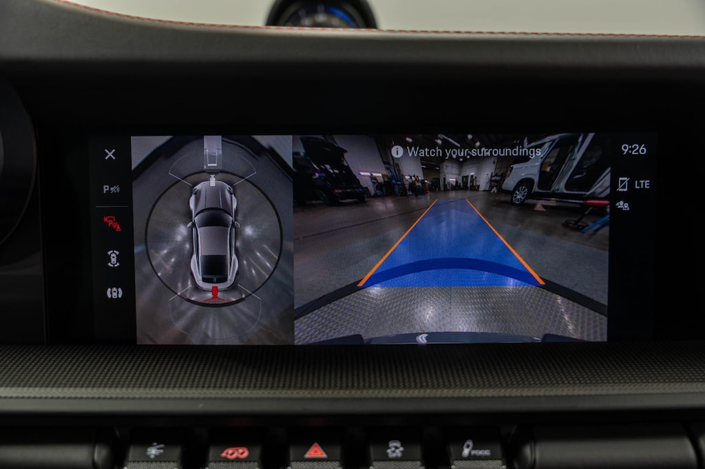 - The vehicle is equipped with a camera that displays an image of the area behind the vehicle on an interior display.